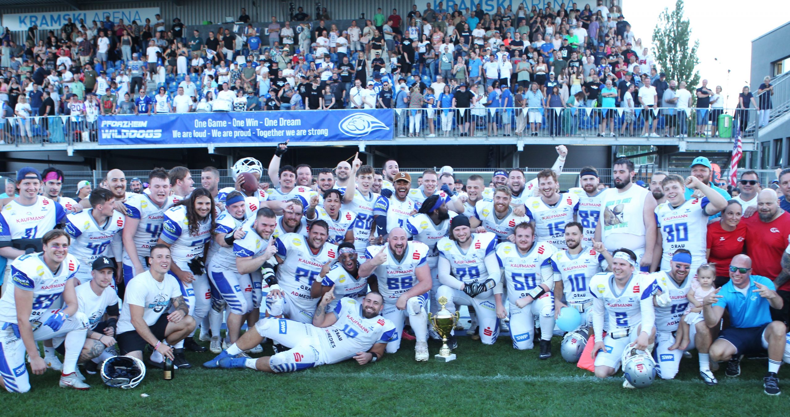 Strahlende Gesichter und ausgelassene Stimmung prägten den Samstagabend im Brötzinger Tal. Unter Flutlicht standen die Spieler der Pforzheim Wilddogs noch auf dem Feld und feierten gemeinsam mit Fans und Familie den deutlichen Sieg gegen die Montabaur Fighting Farmers im GFL2 Süd-Finale. Mit einem klaren 48:06 sicherten sich die Wilddogs die Meisterschaft vor den Augen von 1.500 Zuschauern in der prall gefüllten Kramski-Arena.