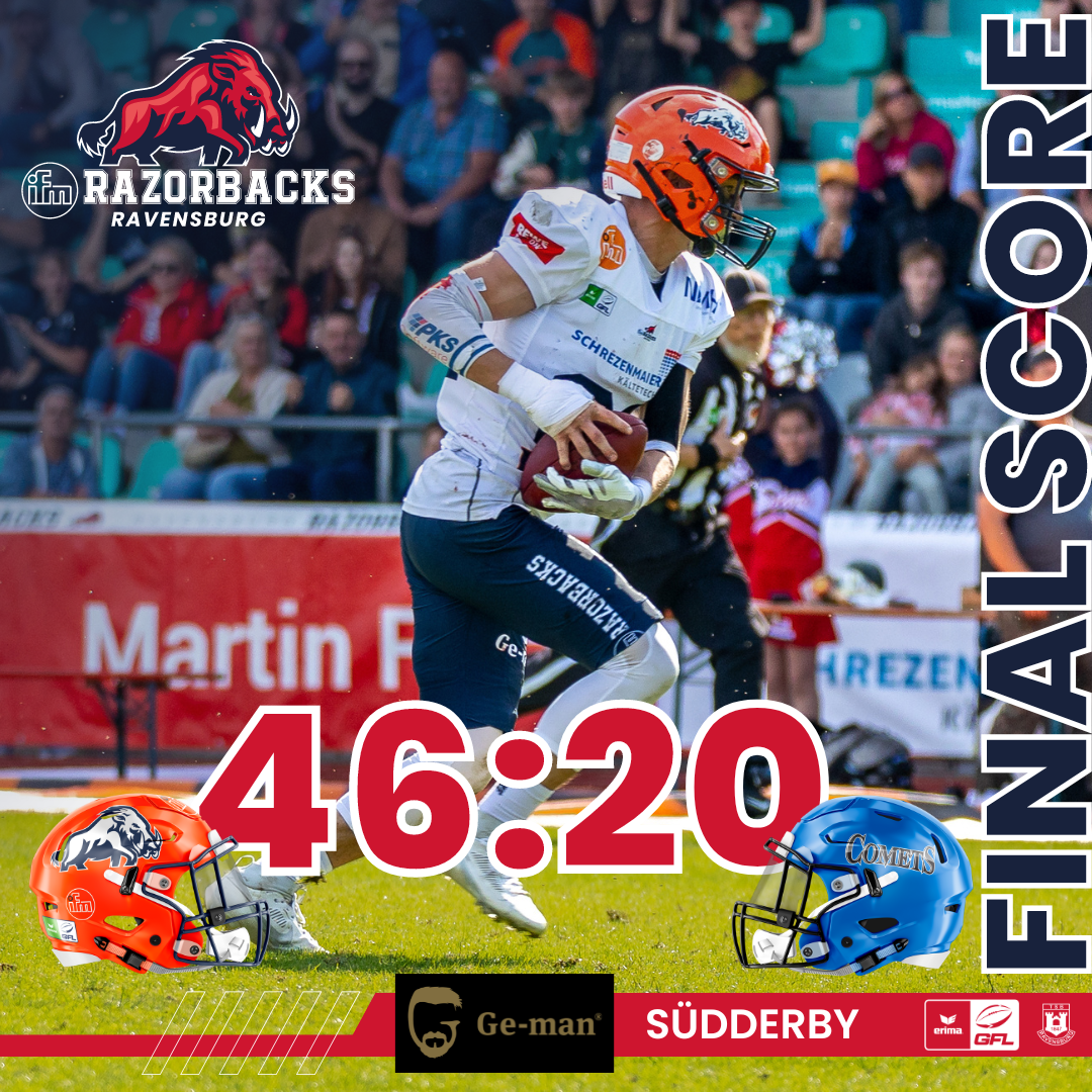 Am Sonntagnachmittag empfingen die ifm Razorbacks Ravensburg im Weingartener Teledata-Stadion vor über 1100 begeisterten Zuschauern die Allgäu Comets zum Süd-Derby-Rückspiel der Erima German Football League (GFL). In einer beeindruckenden Vorstellung sicherten sich die Razorbacks einen verdienten 46:20-Heimsieg und egalisierten damit die herbe Niederlage aus dem Hinspiel.