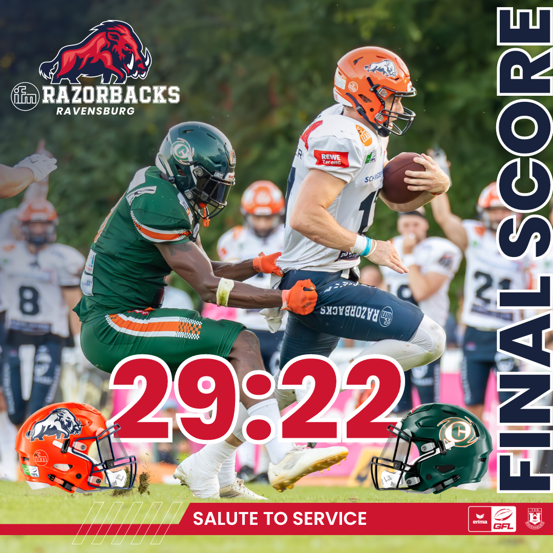 Im folgenden Drive nutzten die ifm Razorbacks die verbleibende Spielzeit von 4:25 Minuten, um den Sieg zu sichern, ohne dem Gegner noch eine Chance auf Punkte zu geben. Dies gelang und die Razorbacks gewannen nach hartem Kampf mit 29:22. Damit stehen die Oberschwaben nun auf Platz 2 der Süd-Staffel und können diesen aus eigener Kraft verteidigen, sollten die beiden kommenden Spiele ebenfalls gewonnen werden. Das nächste Spiel gegen die Saarland Hurricanes findet am 24.08.2024 im TeleData Stadion statt. Tickets für das letzte Heimspiel der regulären Saison 2024 sind online erhältlich unter https://ifm-razorbacks.de/tickets