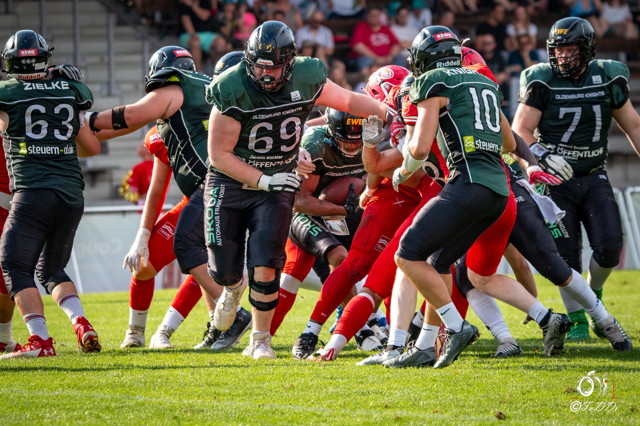 Den ersten von zwei zum Klassenerhalt nötigen Siegen haben sich die Knights somit erkämpft. Am kommenden Samstag fällt beim Oldenburger Nachholspiel in Cottbus (16 Uhr) die Entscheidung. Wobei die Cottbus Crayfish durch eine deutliche 13:68 Niederlage gegen die Düsseldorf Panther bereits als Absteiger feststehen. Den Knights reicht ein Sieg – egal in welcher Höhe. Sollten sie allerdings nicht gewinnen, bleiben an ihrer Stelle die Bielefeld Bulldogs in der GFL 2.