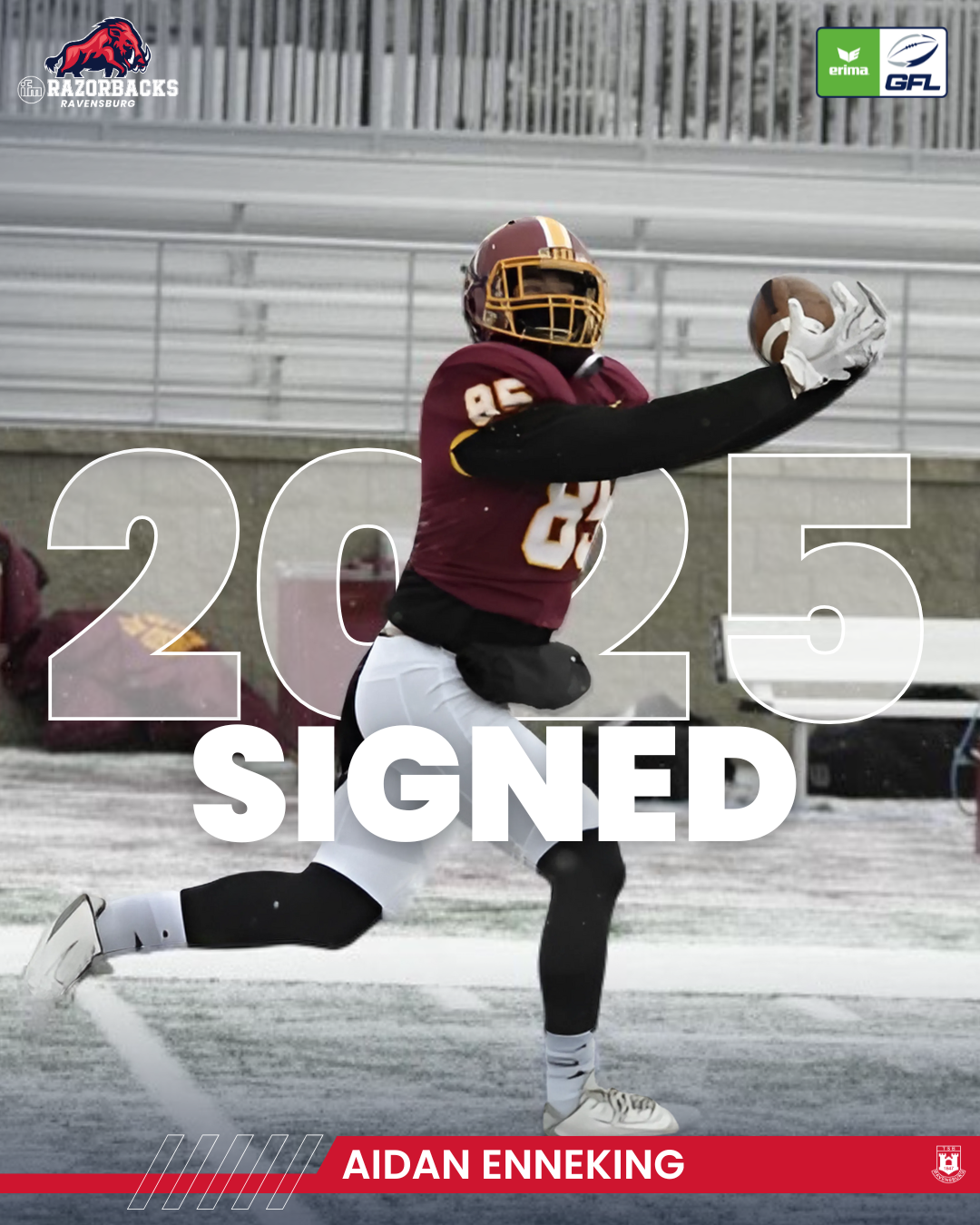 Die ifm Razorbacks Ravensburg freuen sich, die Verpflichtung von Aidan Enneking für die kommende Saison bekannt zu geben. Der talentierte Tight End bringt wertvolle Erfahrung aus der NCAA Division II mit und wird das Offensivspiel der Razorbacks bereichern.