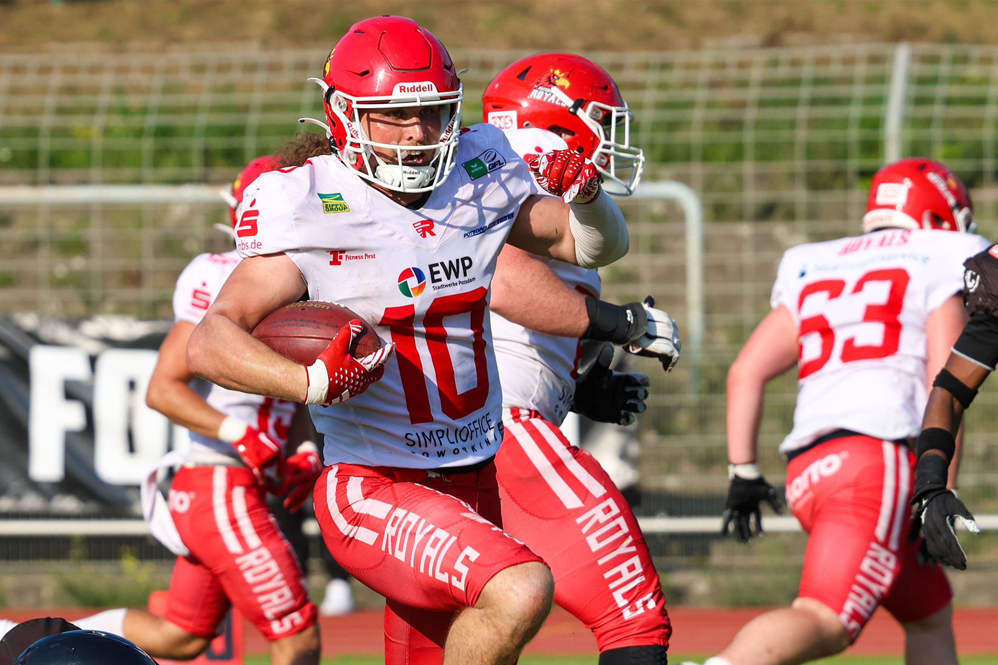 Nach einem wilden „Gruppenkuscheln im Bällebad“ im Midfield unter Beteiligung von Aashari Crosswell (#16), Justice Henley (#0) und Stephan Stadler (#78) kam der Ball irgendwie wieder zu Ronaldo Tomasello, der ihn auch in die Endzone tragen konnte. Der Touchdown zählte jedoch nicht, irgendwer hatte zwischenzeitlich wohl doch ein Körperteil zu viel auf dem Boden. Nach einer Strafe starteten die Royals ihren Drive dann an der 38- Meter-Linie der Berliner.