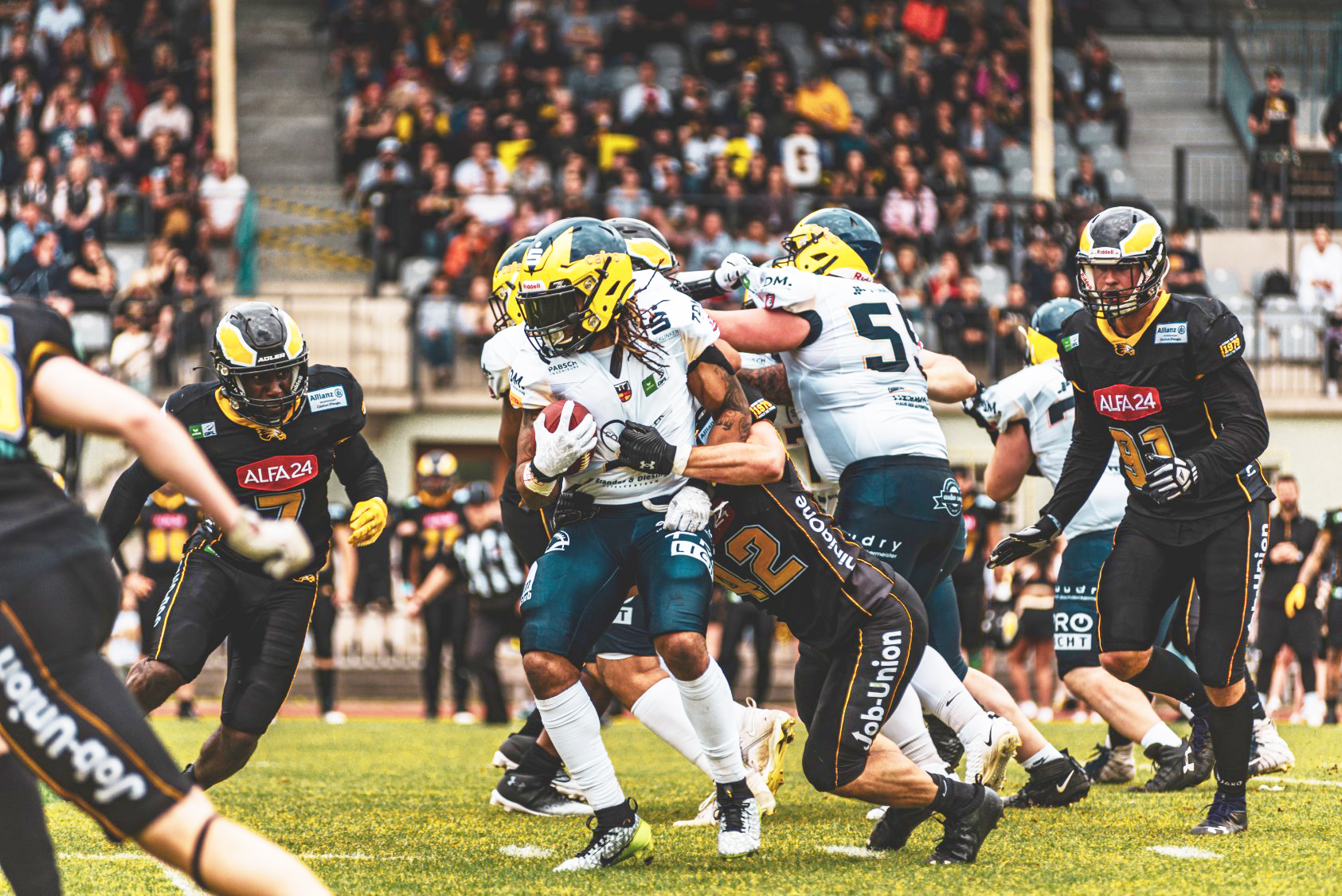 Dass die Invaders die kurze Sommerpause gut verkraftet haben, konnte das Team von Marcus Herford beim deutlichen 56:7-Auswärtssieg in Kirchdorf unter Beweis stellen. Offense und Defense fanden sofort in ihren Rythmus. Das wird nun beim brisanten Aufeinandertreffen mit den Adlern wichtig. Nicht nur, dass die Berliner eine Rechnung mit den Invaders aus dem Hinspiel offen haben. Beide Teams verbindet sehr viel mehr. Berlins Quarterback ist Hildesheims ehemaliger Jugendspieler Hendrik Scharnbacher. Für ihn wird es das erste Spiel auf dem Helios Field seit fast fünf Jahren sein, eine emotionale Rückkehr in die Heimat. Ebenfalls ist sein Headcoach in Hildesheim kein Unbekannter. Zach Cavanaugh führte die Invaders mehrere Jahre in der ERIMA German Football League als Quarterback an. Auch für ihn bedeutet das Spiel eine Rückkehr an die alte Wirkungsstätte. Für Georg Kraft und Alex Knight wird es ein Aufeinandertreffen mit ihrem Ex-Team. Anders, als von vielen Experten und der Community prognostiziert, sind die Berlin Adler nach einer turbulenten Saisonvorbereitung richtig gut in die Saison gestartet und ein heißer Anwärter auf die begehrten Playoff-Plätze. Mit ihrer sehr explosiven Offensive, die mit Spielern wie Max Zimmermann oder CJ Okpalobi echte Playmaker in den Reihen hat, startet Runningback und Eigengewchs Chrisman Kyei richtig durch und ist brandgefährlich. Die Adler-Offense hat ein ähnliches Touchdown-Potenzial wie der Invaders-Angriff. „Beide Teams haben mehrfach gezeigt, dass sie von jeder Feldposition aus punkten können“, sagt Hildesheims Football-Experte Axel Trittmacher, der am Wochenende wieder gemeinsam mit Christoph Scholz das Spiel von den Rängen aus kommentieren wird. „Die Zuschauer in Hildesheim können ein spannendes und spektakuläres Spiel erwarten. Ich denke, dass es viele Punkte geben wird“, so Trittmacher weiter.