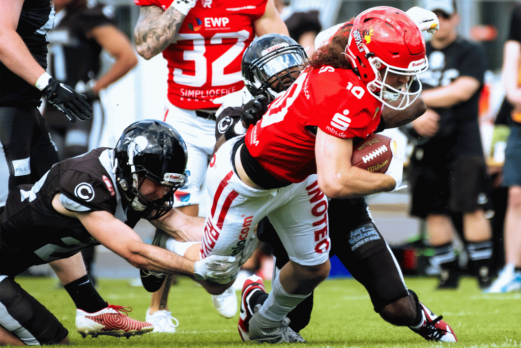 Kiels Sören Haß tackelt Berliner Ballträger im Spiel der Hurricanes gegen die Rebels am 01.07.2023 - Foto: Marc Seefeldt