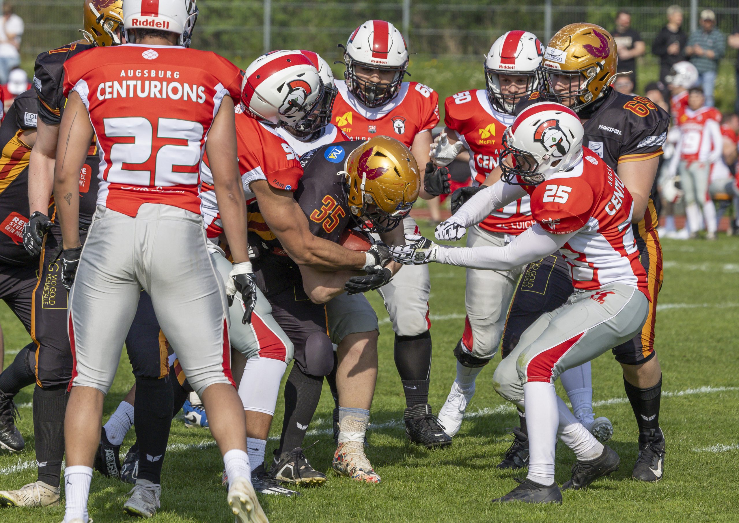 Bei bestem Football-Wetter fanden sich zahlreiche Zuschauer im Stadion am Weinweg ein, um pünktlich um 16Uhr den Kickoff für das Spiel mitzuerleben. Die Gastgeber gewannen den Coin Toss und gaben den Kickoff an Augsburg ab, womit die Regensburger Offense um den neuen US-Quarterback Cameron Yowell (#12) zuerst aufs Feld kam. Die Gäste aus Augsburg generierten allerdings sofort Druck und erzielten ein „3 and out“. Somit kam die Defense aus Regensburg, das Prunkstück der vergangenen Spielzeit, aufs Feld. Die Centurions ließen sich dadurch aber nicht beeindrucken und erzielten nach mehreren guten Läufen und schnellem Passspiel die ersten Punkte, Zwischenstand 0:7. Nach diesem ersten Dämpfer fand auch QB Yowell einen Abnehmer für seinen ersten Touchdown, Receiver Sebastian Lang (#81) erlief nach seinem Catch mit einer Willensleistung die ersten 6 Punkte für Regensburg, durch den PAT von Kicker Dominik Laßmann (#41) stand es wieder 7:7. Die Centurions machten weiter Druck und nach präzisen Pässen wurde schließlich ein langer Ball in der Endzone gefangen. Den anschließenden Extrapunkt konnte Regensburgs Neuzugang „Dino“ Herrera (#5) blocken, womit die Augsburger am Ende des ersten Quarters mit 7:13 in Führung lagen. Die Phoenix-Offense tat sich weiterhin oft schwer, ein verunglückter Pass konnte von den Augsburgern intercepted werden und wurde in der Folge auch genutzt, mit einem Touchdown und verwandeltem Extrapunkt erhöhten die Centurions auf 7:20. So hatten sich das die Gastgeber nicht vorgestellt, zudem kam es in der Folge zu einem erneuten Ballverlust, den sich die Augsburger sichern konnten. Hierbei sprang nichts Zählbares heraus, es folgten mehrere Drives beider Teams ohne Punkte, so ging es mit dem Stand von 7:20 in die Halbzeitpause. Diese nutzte das Heimteam zur Analyse der ersten Halbzeit, man wollte aggressiver in der Defense und effektiver in der Offense werden. Die Defense konnte die Vorgaben nach Wiederanpfiff umsetzen und schickte Augsburg ohne weitere Punkte vom Feld. Leider gelang es auch im folgenden Drive der Offense nicht, bis zur Endzone zu kommen. Nach einem kurzen Punt waren die Augsburger schnell in Schlagdistanz, die Regensburger Defense zwang die Centurions aber zu einem Fieldgoalversuch, der dann erneut geblockt werden konnte, es blieb also beim 7:20. Es folgten wieder Ballwechsel ohne Zählbares, ein gutes Zeichen der Regensburger Defense, die immer mehr Zugriff auf die Centurions bekam. Mit Ballbesitz für Regensburg ging es ins letzte Viertel des Spieles. Nachdem es für Augsburg in der Folge an der Defense kein Vorbeikommen mehr gab und Regensburg durch schöne Catches Raumgewinn erzielt hatte, fand QB Cowell schließlich seinen Tight-End Michael Rauh (#17) in der Endzone, mit dem Extrapunkt von Laßmann (#41) verkürzte das Heimteam auf 14:20. Nun schöpften die Regensburger Hoffnung, den zwischenzeitlichen Rückstand sogar noch zu einem Sieg zu drehen. Der erste wichtige Schritt hierfür bestand in einem geblockten Punt, der von der Defense auf der 22-Yard-Linie gesichert werden konnte. Erzielte man jetzt einen Touchdown inkl. Extrapunkt, war das Spiel gewonnen. Der Touchdown ließ nicht lange auf sich warten, US-Receiver Nicolas Hayes (#2) fing den Ball in der Endzone, Spielstand 20:20, noch wenige Sekunden auf der Uhr. Die Centurions hatten allerdings andere Pläne als ein Happy End für die Gastgeber, der Extrapunkt wurde geblockt und es blieb letztendlich beim Unentschieden.